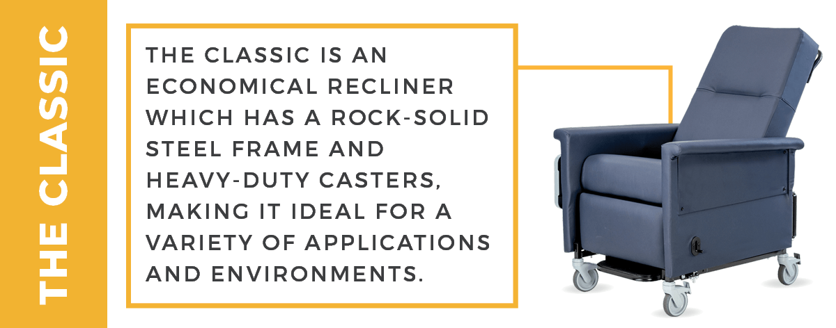 Champion’s Classic recliner, commonly used in dialysis settings, features infinite recline positions and either stationary or swing-away arms to provide optimal patient comfort and better access for caregivers. With fold-away tables, foot trays and quick-release seats, caregivers get more versatility and convenience from the Classic.