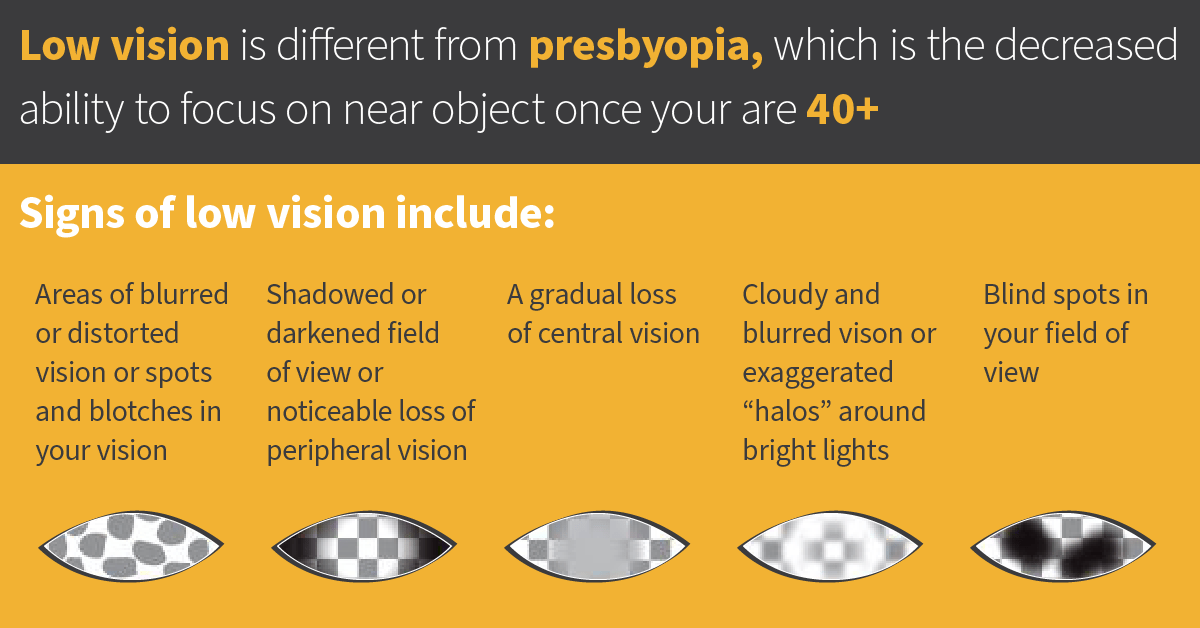 Low vision is not the same as blindness, since limited sight remains. It is also different from “presbyopia,” which is the decreasing ability to focus on near objects that tends to happen naturally as one ages after forty.