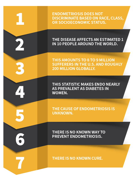 Did you know? Nearly as many women suffer from endometriosis as diabetes. If endometriosis was funded by the National Institutes of Health (the primary federal agency for conducting and supporting medical research), at just half the level of diabetes, the budget would increase almost 16 times to more than $250 million annually.