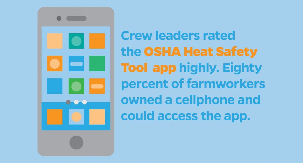 For this study, 6 crew leaders completed a 2-hour OSHA heat illness prevention training, including evaluation of a heat safety mobile app. Between August and October 2018, 101 Hispanic farmworkers participated in a survey about heat safety. Survey participants responded to questions about HRI prevention, HRI knowledge, and sociodemographics.