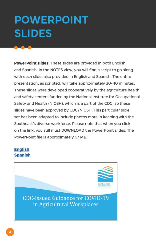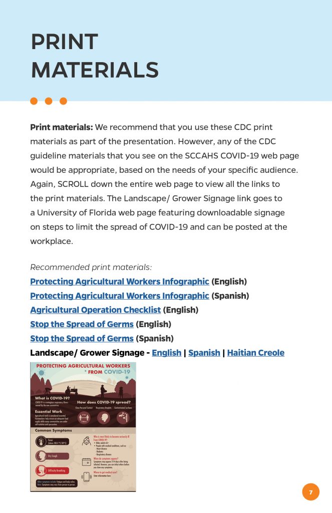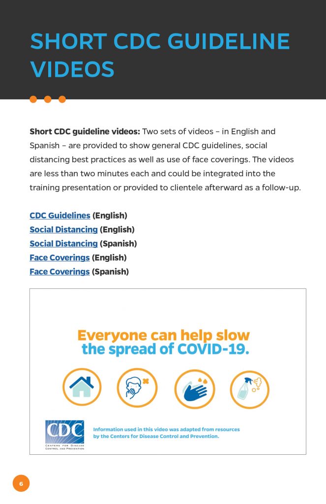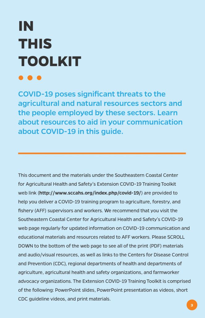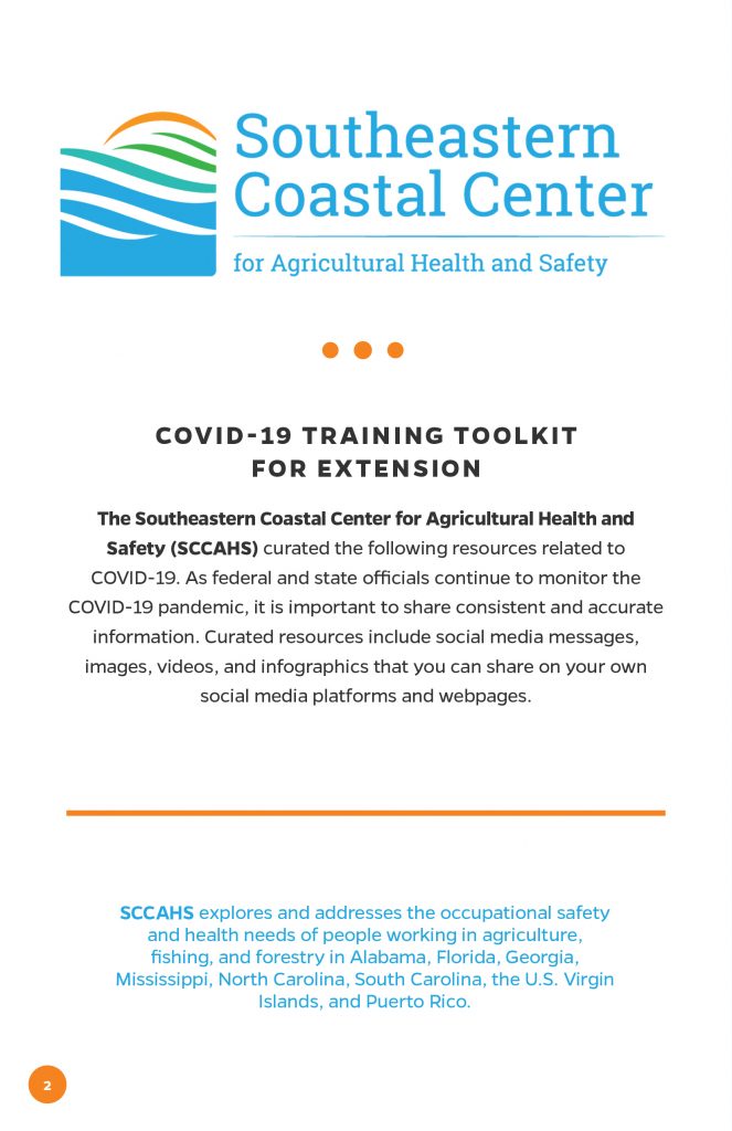These resources include social media messages, images, videos, and infographics that you can share on your own social media platforms and webpages. The COVID-19 Training Toolkit for Extension packages PowerPoint presentations, videos, and print materials to inform agricultural owners and workers about best practices to prevent COVID-19 in the agricultural workplace.