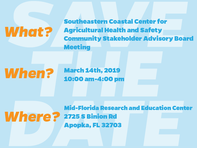 The Southeastern Coastal Center for Agricultural Health and Safety’s Community Stakeholder Advisory Board will meet to provide feedback on the future of the center.
