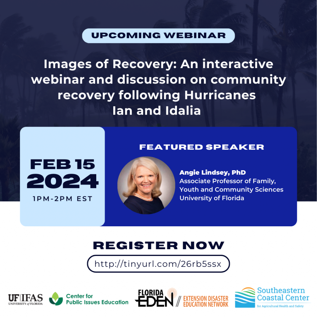 Past experience and literature have shown that impacts from natural disasters can affect long-term recovery in communities, including the personal, social, behavioral, and mental health aspects of daily life. In this upcoming webinar, Dr. Angie Lindsey will share information about an upcoming photovoice research project aimed at addressing long-term recovery needs that are integral in the disaster management process including preparation, mitigation, response, and recovery. In photovoice projects, researchers can identify pertinent post-disaster issues, needs and gaps, pinpoint areas of growth in disaster recovery, and connect individuals and communities with resources that will allow them to maneuver past the adversities that can remain stagnant from disasters.