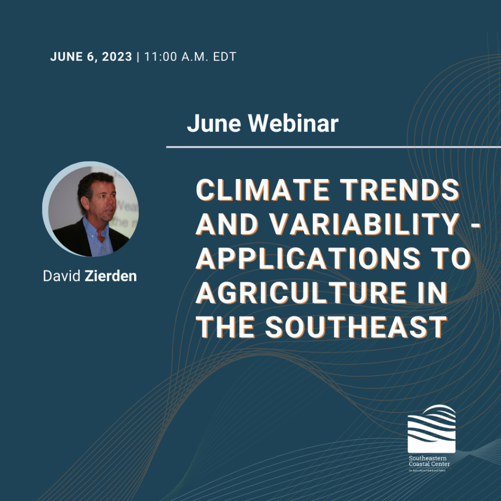 Climate trends and variability play an important role in agriculture and the risks faced by producers. Climate predictions and agricultural forecasting provide a critical support structure for the agricultural industry so producers can make informed decisions related to climate variability. In our upcoming webinar, hear from David Zierden as he shares about weather and climate threats as they apply to Southeast U.S. agricultural production. Zierden is the Florida State Climatologist from the Florida Climate Center, which is the leading authority on climate variability in Florida. Register for the webinar to learn about weather and climate trends related to extreme heat and cold, sea level rise, hurricanes, precipitation, and other factors that impact the stability of the agricultural industry.