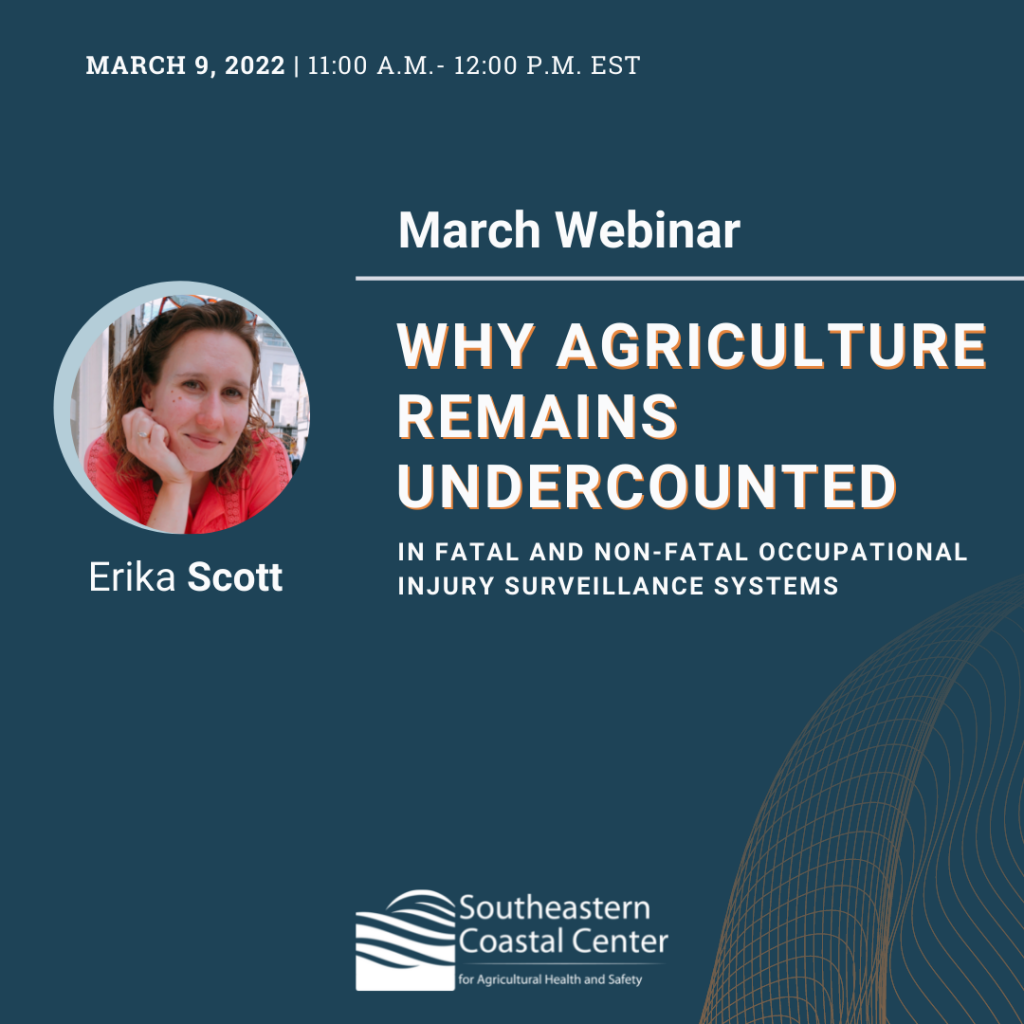 On March 9, at 11 a.m. Eastern, Dr. Erika Scott will present challenges in surveillance, highlight key procedural gaps, and offer recommendations for advancing national surveillance of fatal and non-fatal traumatic injuries associated with production agriculture.